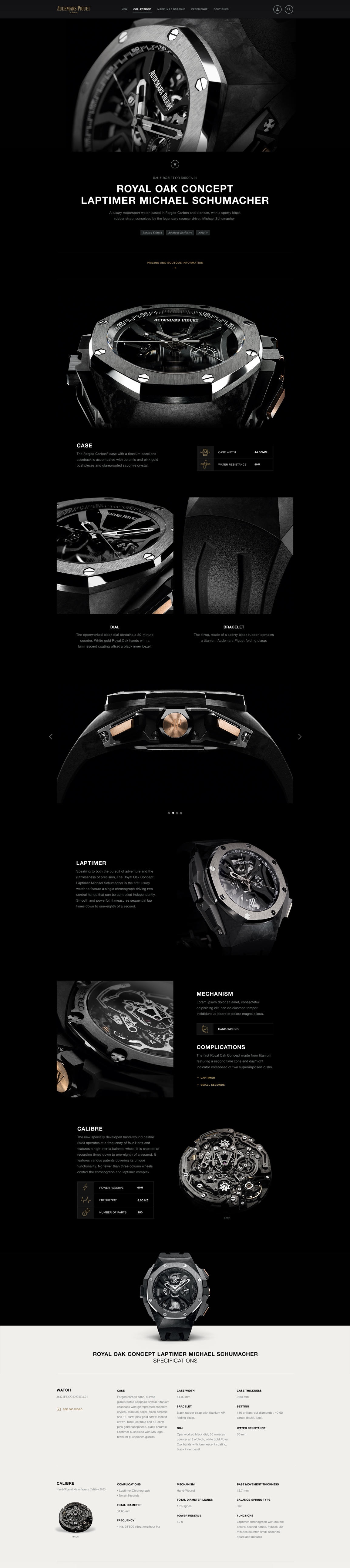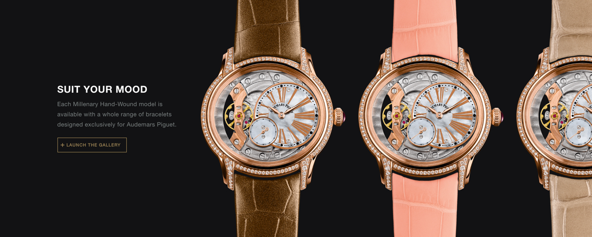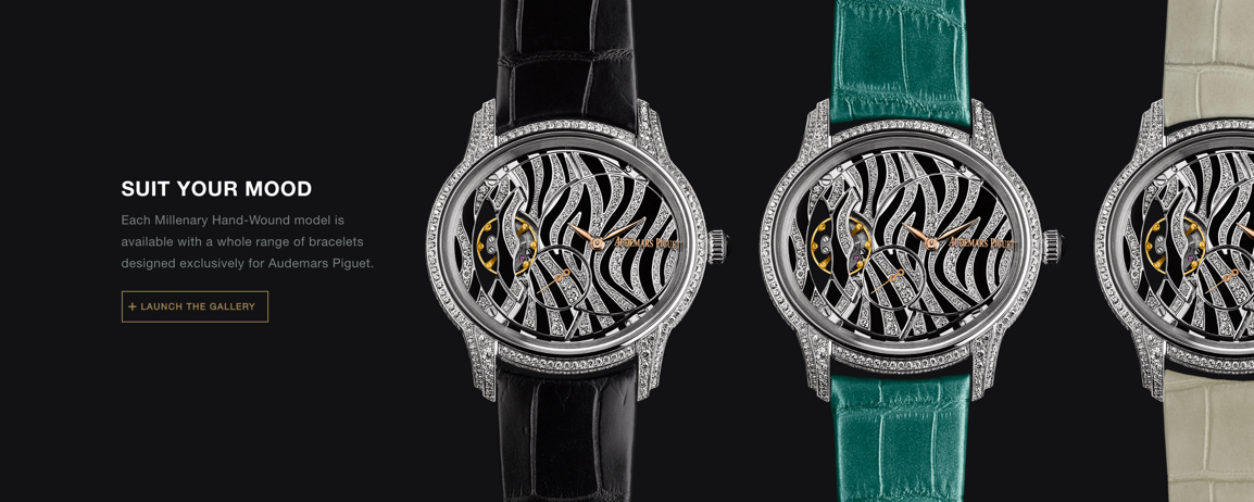 Some AP watches come with a range of case and strap options to choose from. I designed this light-weight watch strap configurator for the Millenary collection that allows users to browse different case & strap combinations to find the one that best matches their style. Users can even pair the watch they created with a themed background at the end to complete the look.
