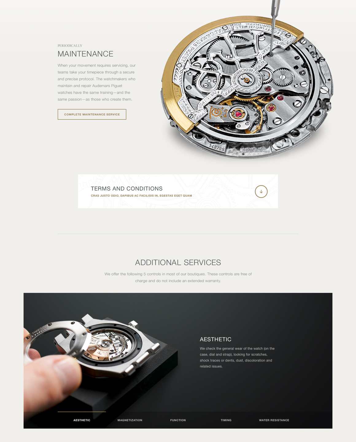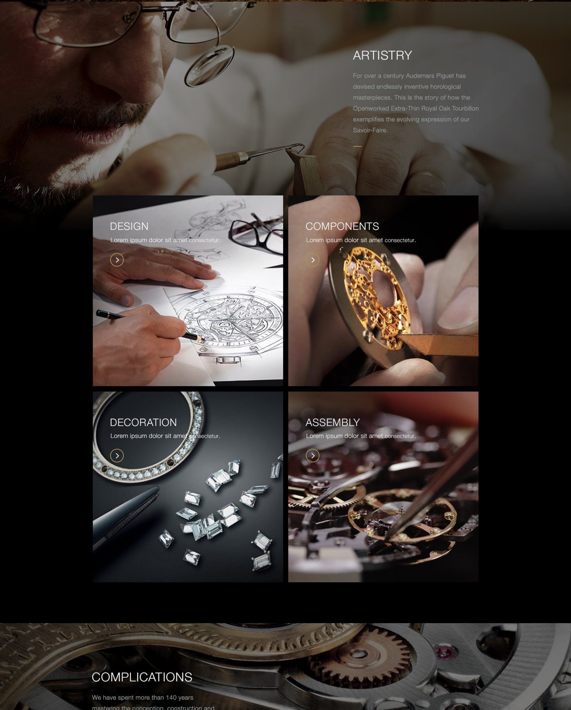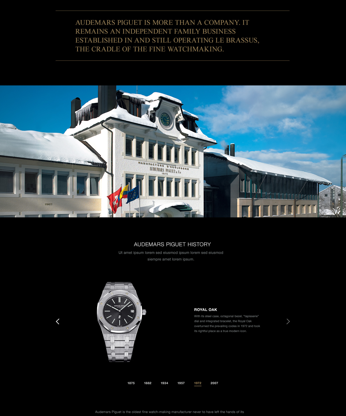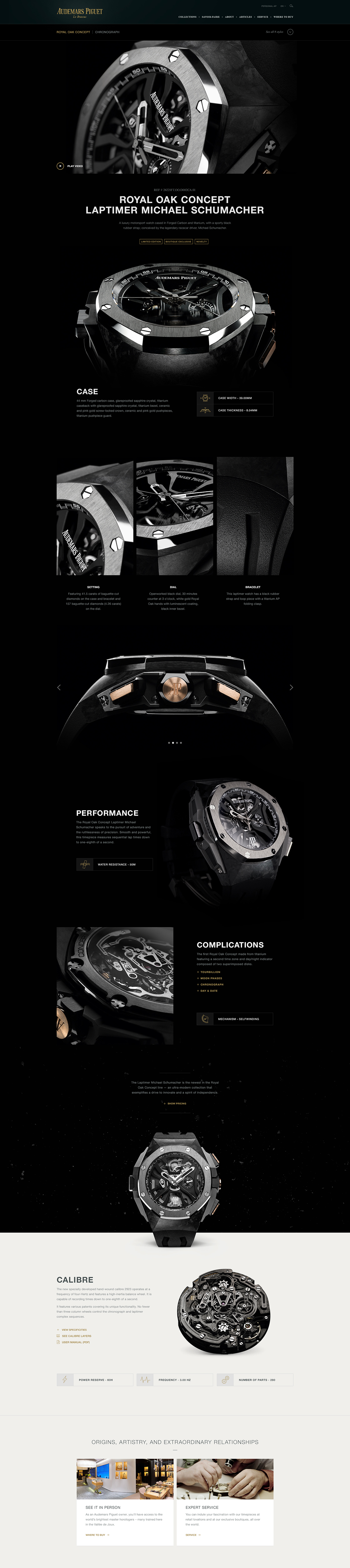 When possible, the team found ways to push interactivity on the site. I worked with the UX team to completely revamp the Where to Buy section from a list & image format to a searchable, full-screen map experience. It was important that the map encourage customers to visit AP-exclusive boutiques over general watch retailers, so I gave AP boutiques special result tiles with a photo of the boutique and made their map pins gold to stand out against the black retailer pins.