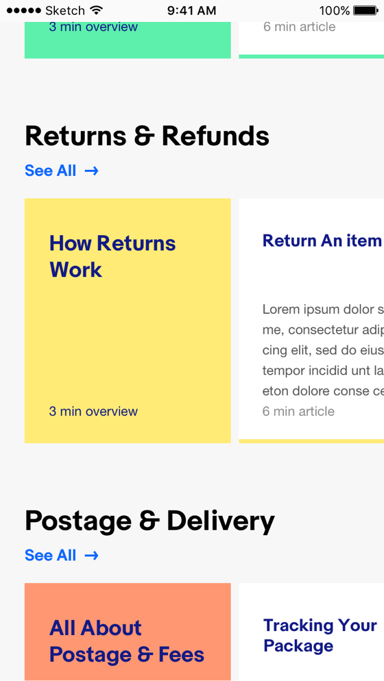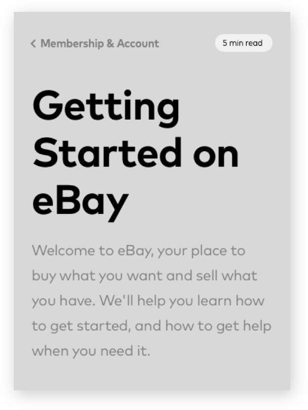 The Articles embraced the colorful side of the new eBay brand. We expanded the system colors to include 4 article colors: teal, yellow, purple, and orange, each with a secondary tint to pair with it.