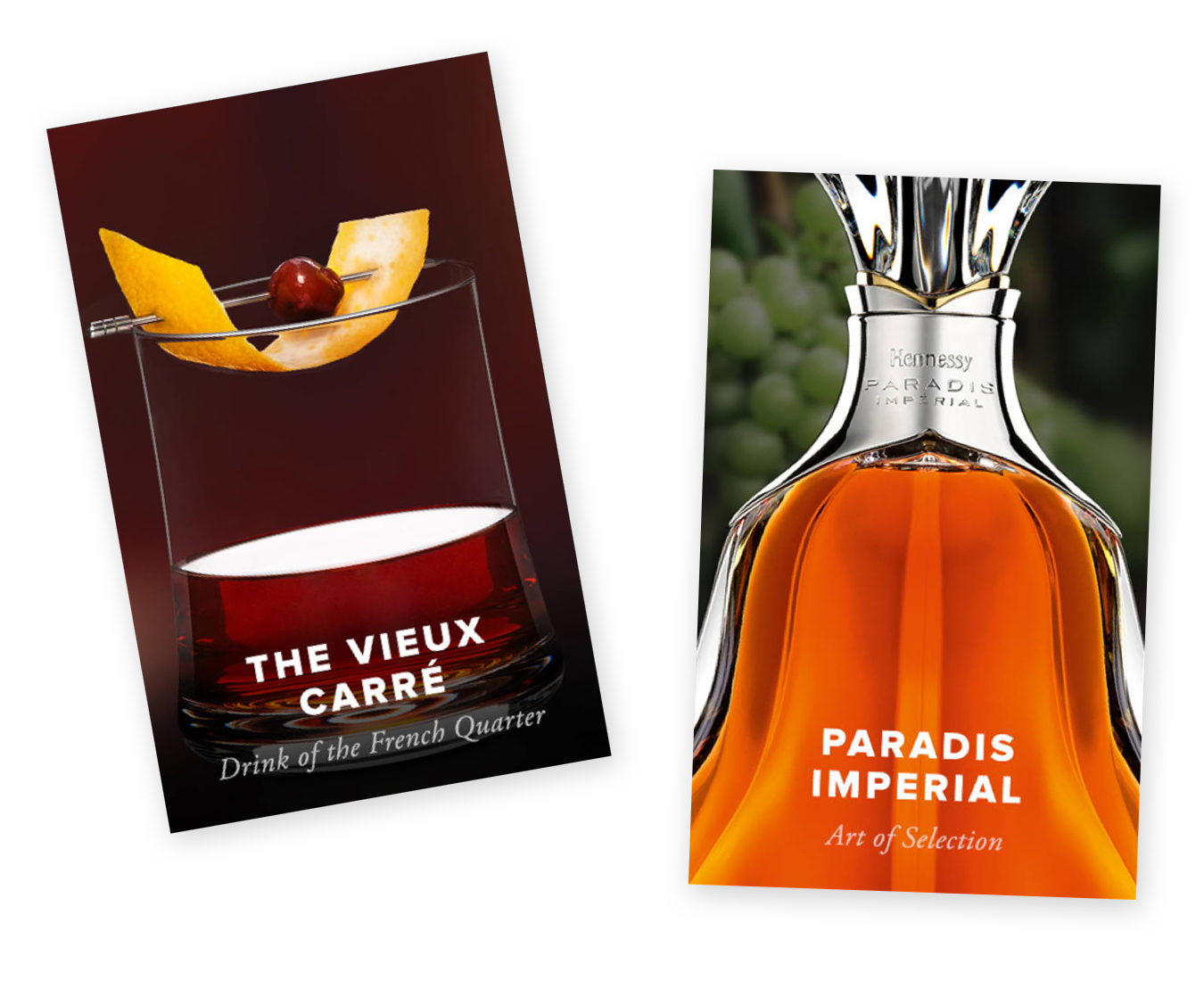 For the product cards, I cropped close in on the bottles show off their disctinct shapes, and used background fills behind the glasses to add to the richness of cognac. The type stayed classic Hennessy; a bold title and simple description.