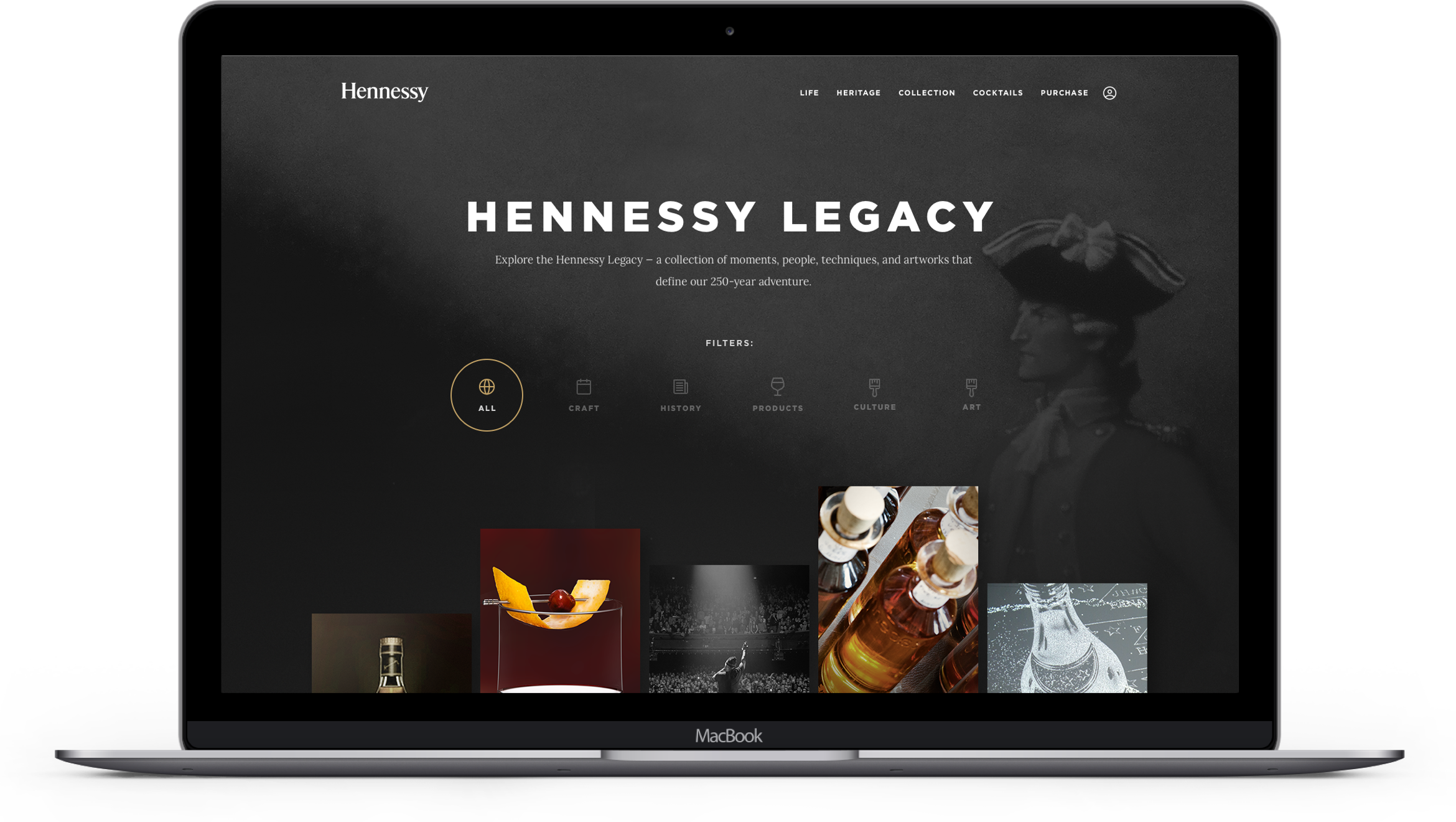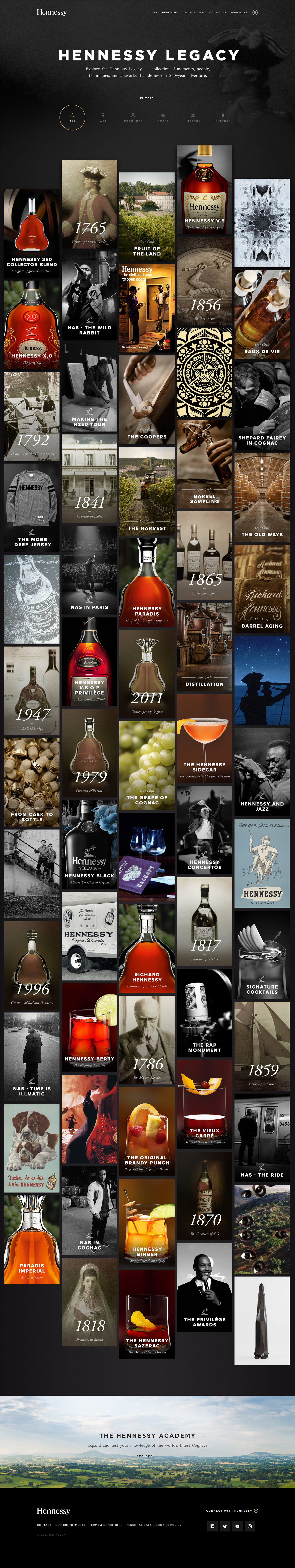 Hennessy’s 250-year adventure is definied by 5 different types of content — craft, history, products, culture, and art — each with a different visual card treatment.