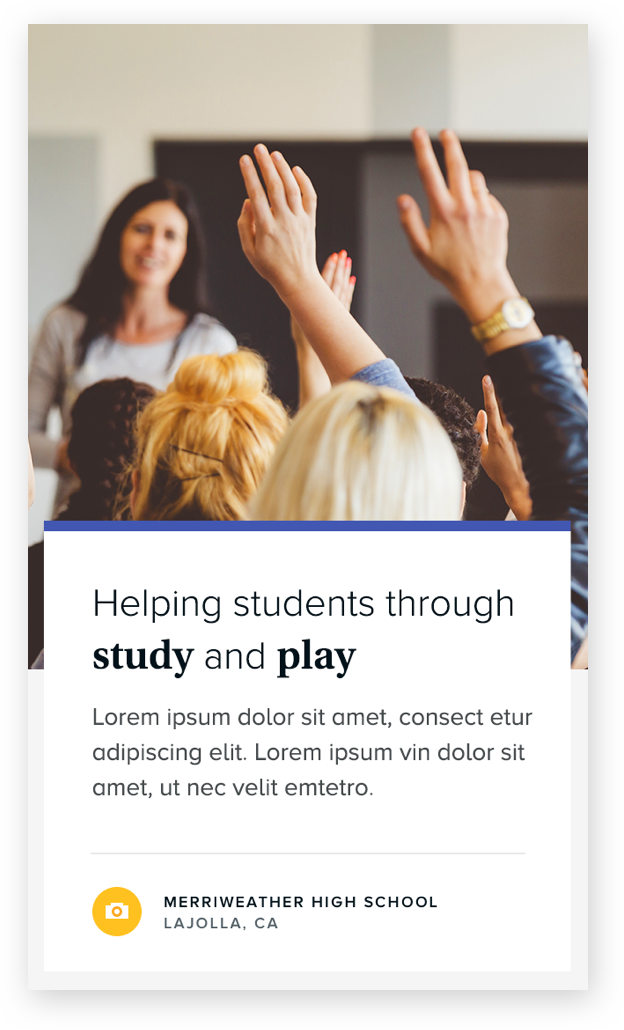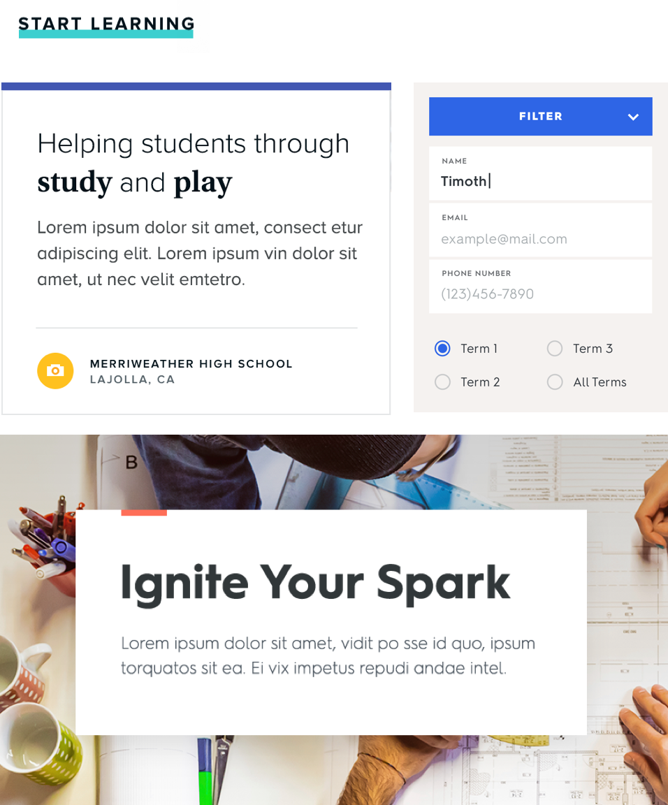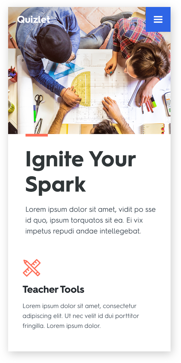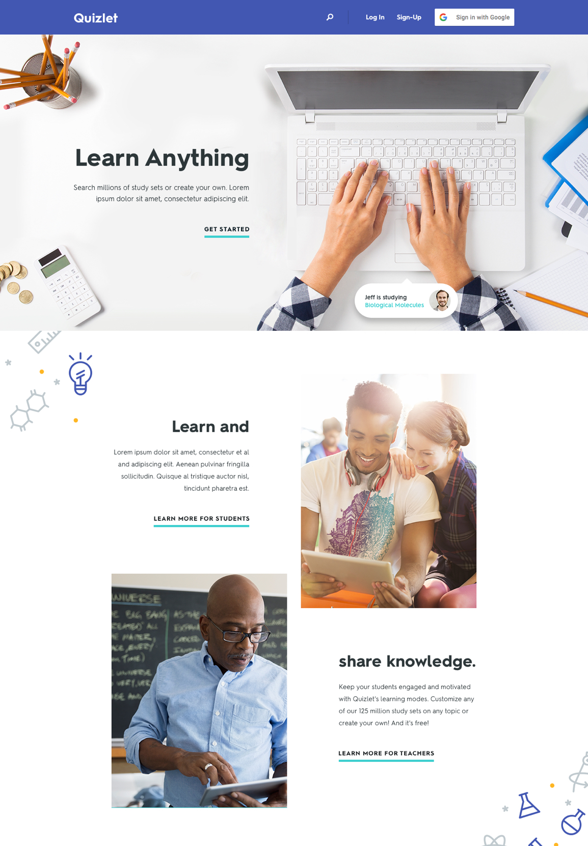 Because the majority of Quizlet users are students, the first themeboard I designed targeted a young audience. I went with a bright color palette that flooded section backgrounds and overlayed on top of lifestyle photography, and used rounded UI and tactile cards to make the design feel youthful, approachable, and fun. I enjoyed creating the quirky and colorful icons with thin-strokes and off-set color fills to finish off the design.
